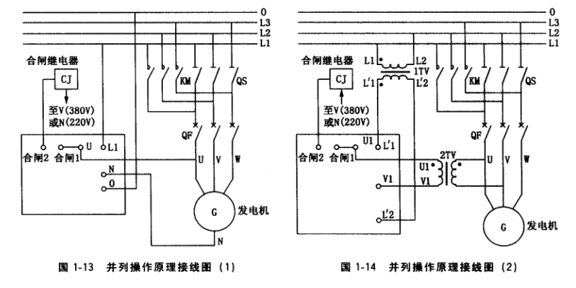 ① 断开隔离开关QS,合上空气开关QF (对于无QS直接用QF的,则应断开QF),然 后起动待并机组,调节其转速和电压,通过频率表、电压表、同步指示仪检测,确认上述4 个条件与主机相同时,迅速合闸,交流接触器KM接通,然后合上QS, KM断开,完成并 列投人操作。合上该机负荷开关,投人并列带载运行。