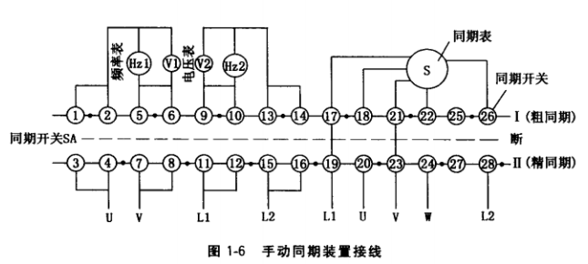 ① 要认真检査同期装置各仪表工作是否正常,两只电压表和两只频率表的准确度应基本 一致,无卡壳现象,以免发生仪表指示误差。