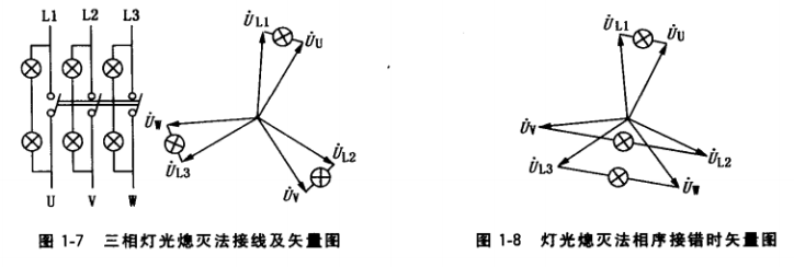 ①三相灯光熄灾法。图1-7是相灯光熄灭法并机接线及矢量图。对于400V系统,每 相用两个220V灯泡串联后,跨接在对应相开关两端(对于220V系统.只要用一只220V