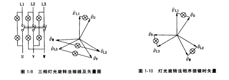 ② 灯光旋转法。图1-9是灯光旋转法并列接线。当相序一致时,待并发电机和系统电压 向量间的关系如图所示。从图中可看出,在任何时间3组灯的亮度不一样,呈旋转变化。当 发电机满足同期条件时,加在L1、U间的电压为零,加在L2、W和L3、V间的电压均为线电压,因此,接在L1、U间的灯泡熄灭,此时可将发电机并人系统。若待并发电机相序 接错,如图1-10所示,则3组灯光不是旋转发光,而是同明同暗,此时不能将发电机并人 系统。