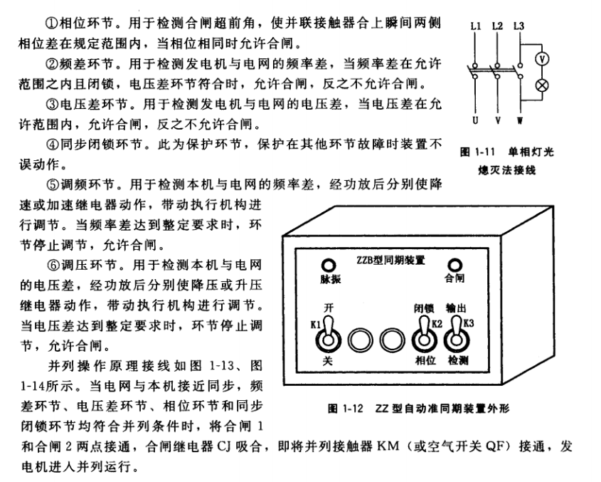 (3) 自动准同期装置并列。为了提高并列动作的准确性,减少合闸冲击电流.以有效保 护发电机,可采用自动准同期装S并列。ZZ型自动准同期装置外形见图1-12。