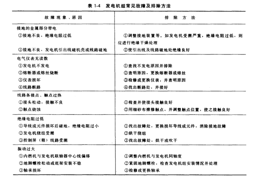 发电机组常见故障现象、原因及排除方法见表1-4。