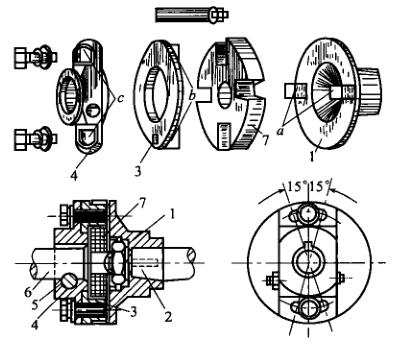 1-从动凸缘盘2-喷油泵凸轮轴3-中间凸缘盘4-驱动凸缘盘5-销钉6-驱动齿轮轴7-夹布胶木垫盘
