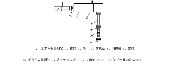 3) 用螺栓将消声器、弯头、垂直方向排烟管、波纹管按附图联接好,..各处密封良好。