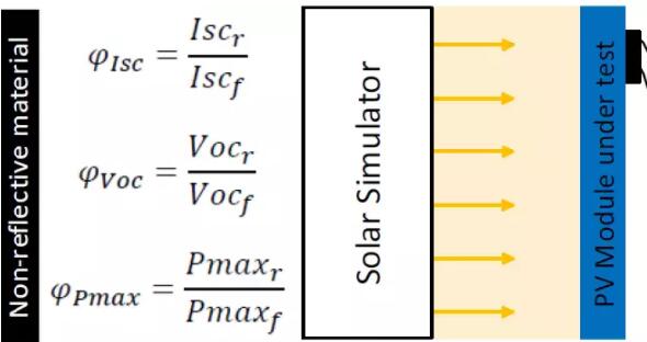 TÜV莱茵内部标准2PfG 2645/11.17 中规定可以使用IEC 60904-1-2中的单面辐照和双面辐照测试方法,不过目前在TÜV莱茵的实验室中使用的是单面辐照测试方法。除了BSTC下的测试,背面辐照度 (Gri) 为100W/sqm 和 200 W/sqm 时的IV测试结果也可以作为补充信息在测试报告中提供。 如下图所示,单面辐照测试方法首先对双面组件正反两面分别在STC条件下进行功率测试,然后再测试组件正面在等效辐照度(GEi)下的光伏特性。等效辐照度(GEi)由以下公式计算得出:
