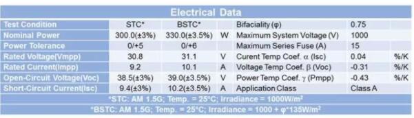 对于单面组件而言,定价的最重要的参考依据目前依然是标准测试条件(STC:组件温度25ºC,入射辐照度1000 W/sqm,光谱分布为AM1.5G)下的功率标定。而对于双面组件的电性能测量,我们在基于STC所作假设的基础上增加双面组件以37° 的倾斜角度和1米的离地高度安装时的条件,由此确立了双面标准测试条件(BSTC)。