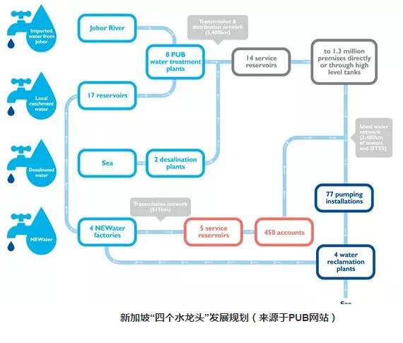 也在同一年,受到NEWater示范项目成功的鼓舞,PUB提出重新制定新加坡的供水水质规划——“四个国家水龙头”计划,计划到2060年,即与马拉西亚供水协议到期前一年,新加坡将完全实现水资源的自给自足,在新加坡的总人口已达到目前的3倍的前提下,海水淡化和NEWater能够满足水资源需求量的80%,其中NEWater占55%。